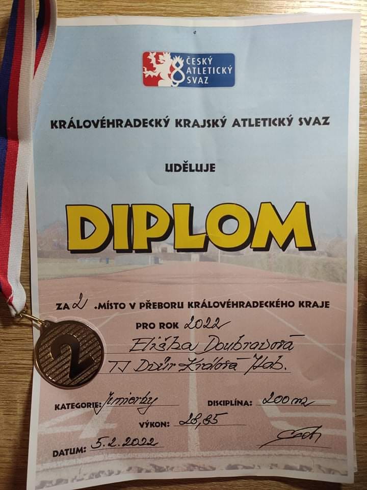První letošní medaili získala juniorské kategorii Eliška Doubravová. A to na trati 200m. Úspěšná sprinterka je momentálně v plné přípravě na ligu a tak její výsledky budou ještě gradovat v letní sezóně. Myslím, že se máme na co těšit.